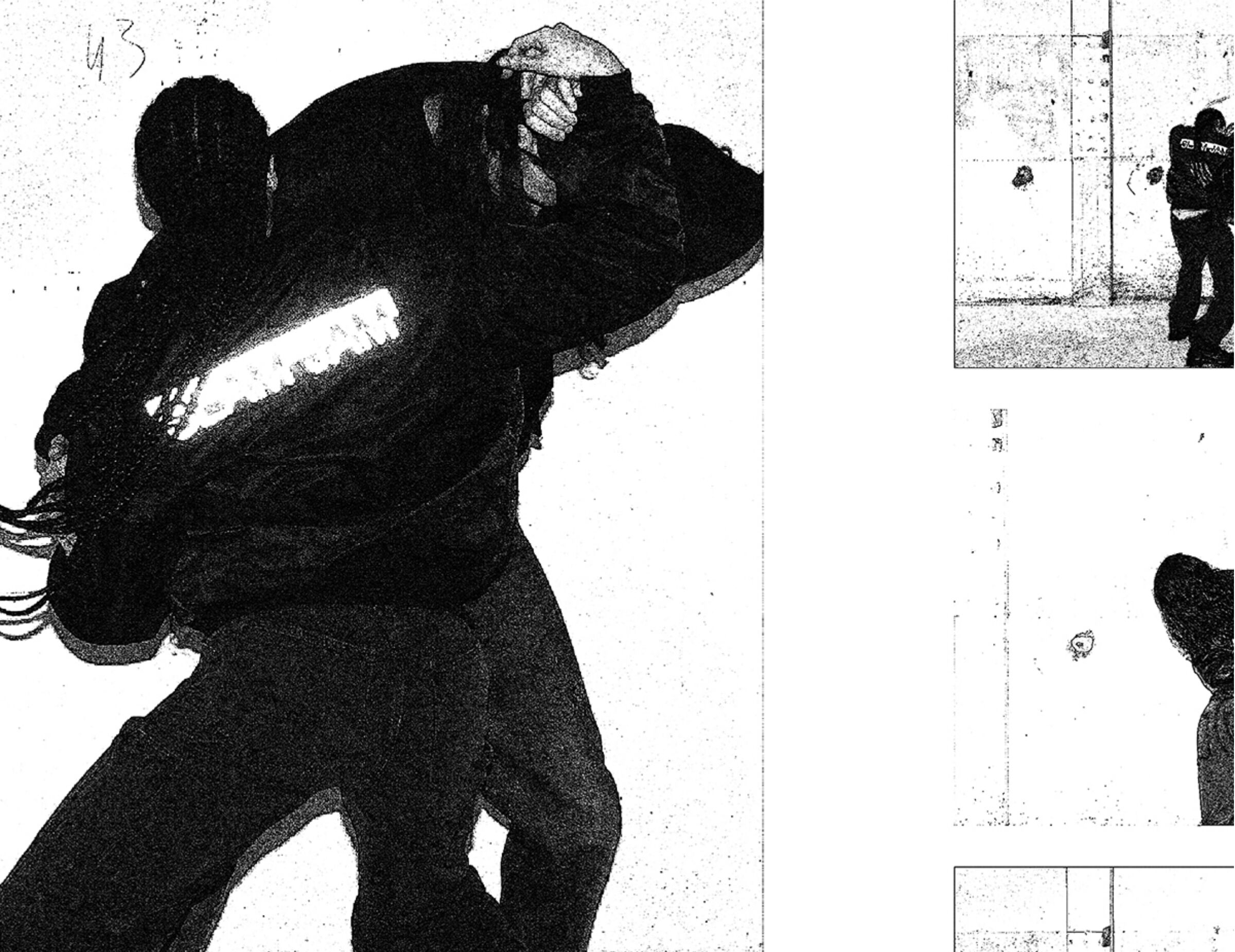 with the aesthetic of two-tone reflective graphics in Italian police uniforms, Slam