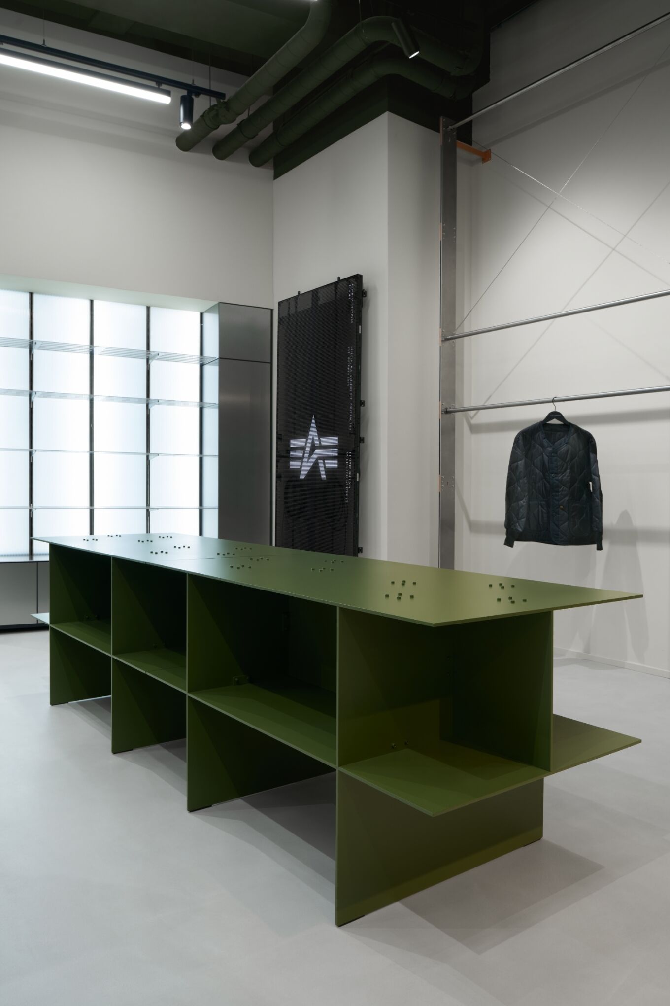 Military-inspired structural elements, reminiscent of aircraft frames, and subtle green accents add a bold, industrial character, while warm orange seating adds contrast, creating a welcoming space within the store’s functional framework.