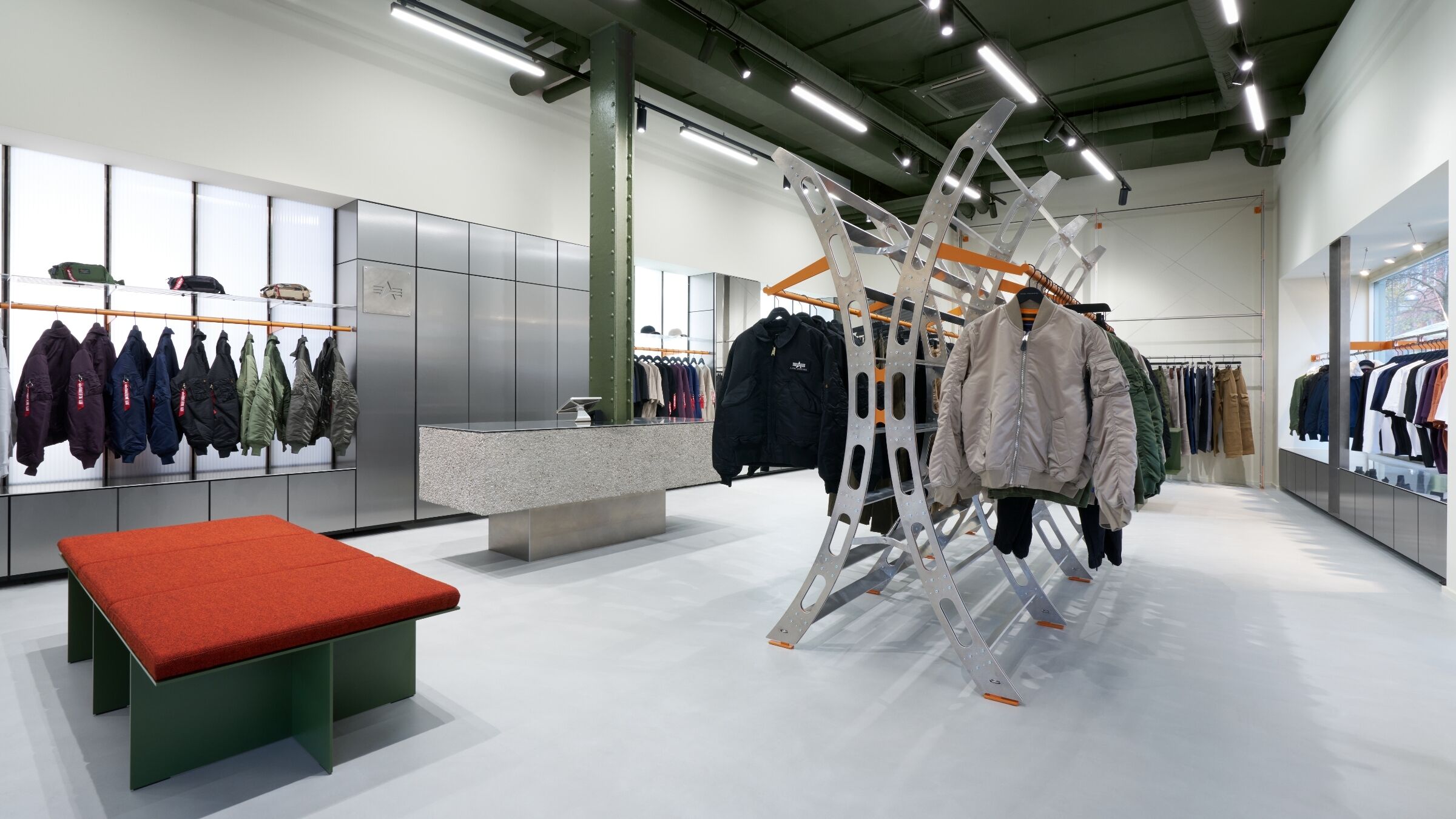 Known for their innovative approach to industrial design, they have crafted a space that embodies Alpha Industries’ legacy of military heritage while introducing a refined, contemporary edge. The design features clean lines, polished concrete, steel fixtures, and modular displays, capturing both the strength and simplicity that Alpha is known for.